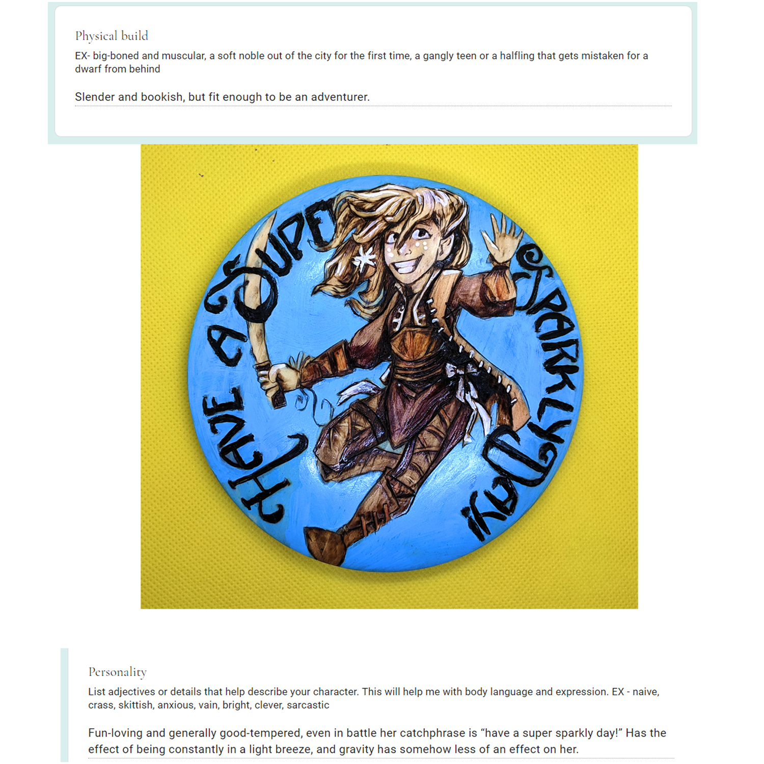 Dungeons & Dragons, Monster of the Week, a character in your novel, or your World of Warcraft avatar. Fill out a detailed form (how detailed is up to you!) telling me about your character’s physical traits and personal quirks.